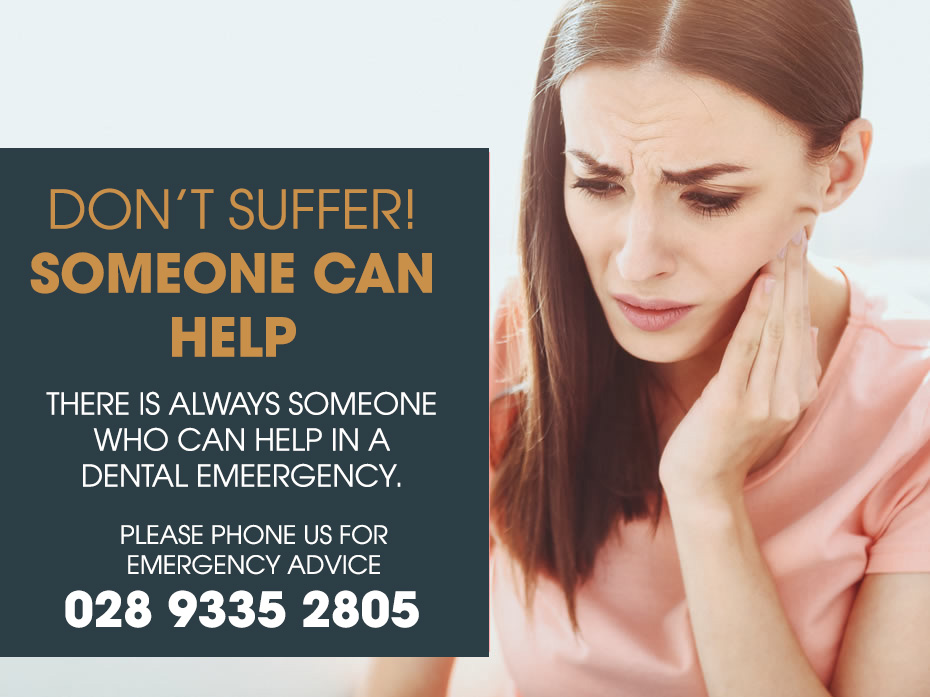 To ease the pain of a toothache while you are waiting to see your dentist speak to a pharmacist and they will advise you on the best over-the-counter painkiller to help with the discomfort. You should also floss around the area to dislodge any food that might be causing the pain. If you have facial swelling, apply a cold compress to the outside of your mouth/cheek. Contact Ballyclare Dental for an emergency appointment as soon as possible.